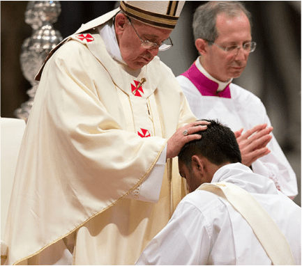 All parishioners participate in the priesthood of all believers through Baptism. However, some men are called to serve the Church through the celebration of the Sacrament of Holy Orders. Through their leadership these men are living examples of Jesus’ presence on earth through the tradition of the apostles. There are three levels of participation in this Sacrament: as Bishop, priest, and deacon. They receive the Sacrament of Holy Orders in the Rite of Ordination. In the Rite of Ordination, the Bishop lays his hands on the candidate and says a consecratory prayer, and the candidates hands are anointed (in the case of a bishop, his head).