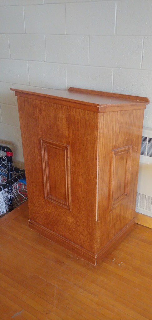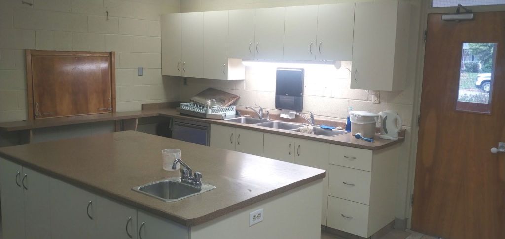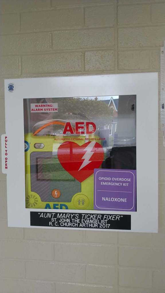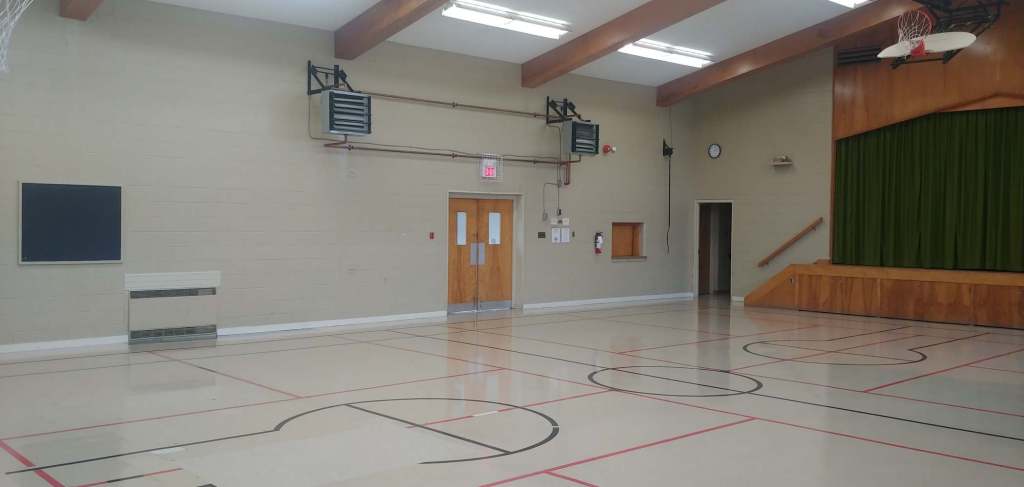 Our Parish Centre is open for use to members of our parish community, and can be used for fellowship, celebrations, family gatherings, funeral luncheons, and other Church/Parish events. We have 1 classroom/meeting room, a full kitchen, hall/gym, and washrooms (including wheelchair access, with a change table & recliner). You are welcome to book, pending approval, on week days after 4pm, and on weekends. (see pictures below). There is an AED (Automated External Defibrillator) on site just inside the front entrance.